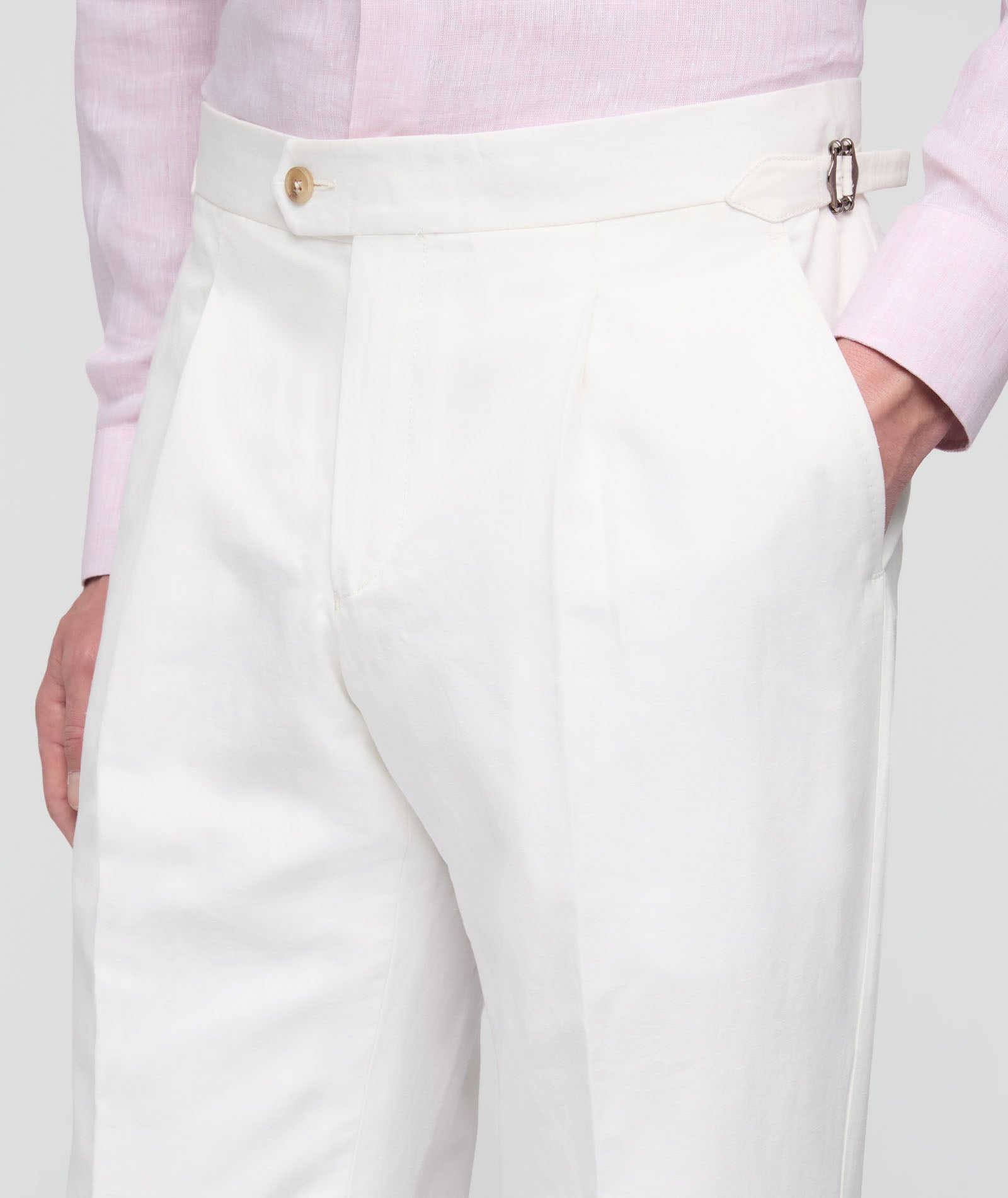 This made-to-measure suit is made in Italy with a white linen-cotton blend fabric from the Zignone wool mill. Made of a Linen-Cotton blend, it is cool and light. Perfect for leisure time and an exclusive summer look, ideal even for seaside ceremonies.